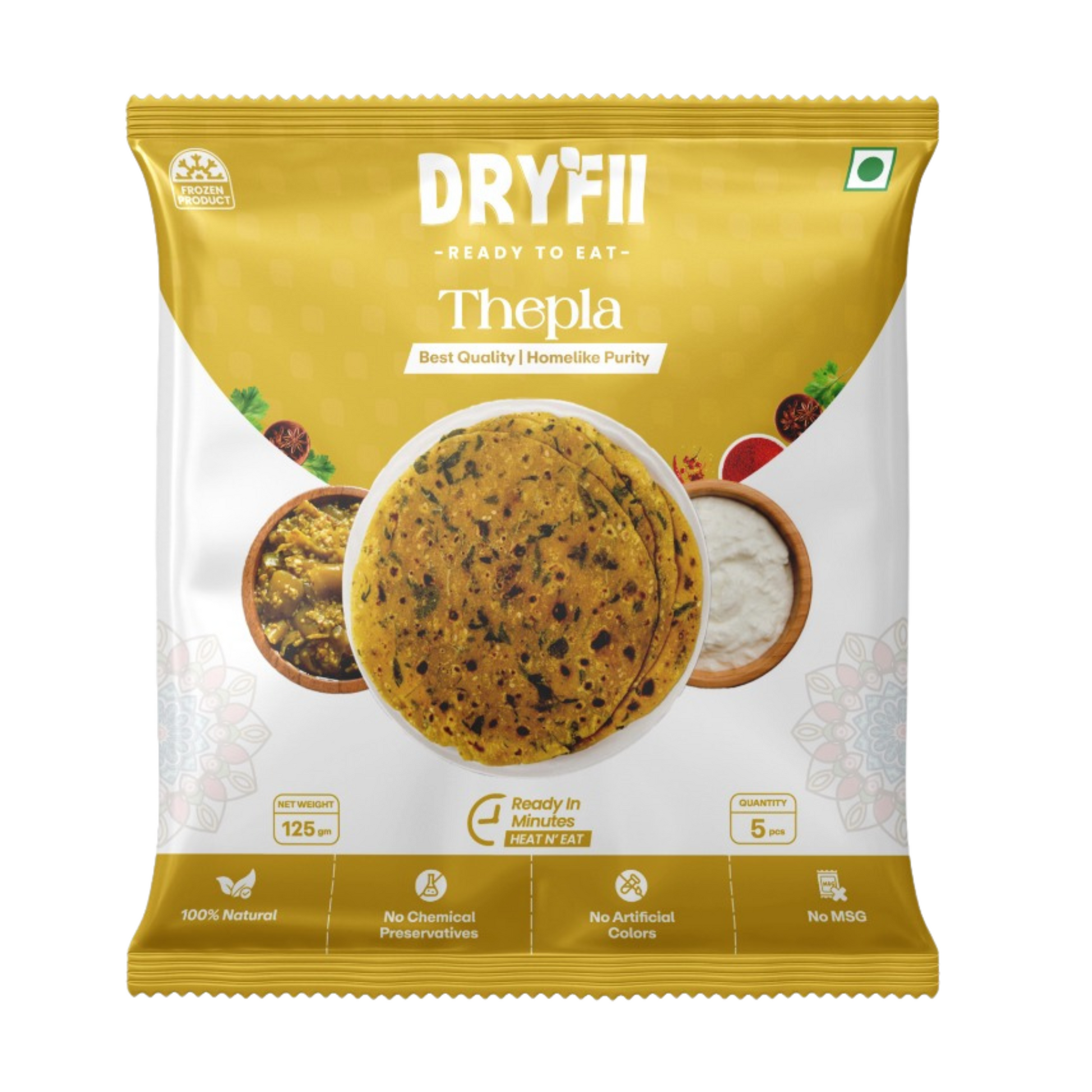Dryfii Thepla is made with whole wheat flour (atta), salt, milk, desi ghee, and a blend of spices, offering a flavorful, soft paratha with a delightful, savory taste.